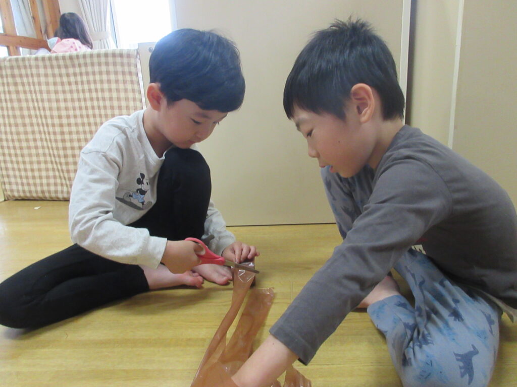 必要な材料を自分たちで考え、園の教材庫や家庭から持ってきて、作り始めています。
