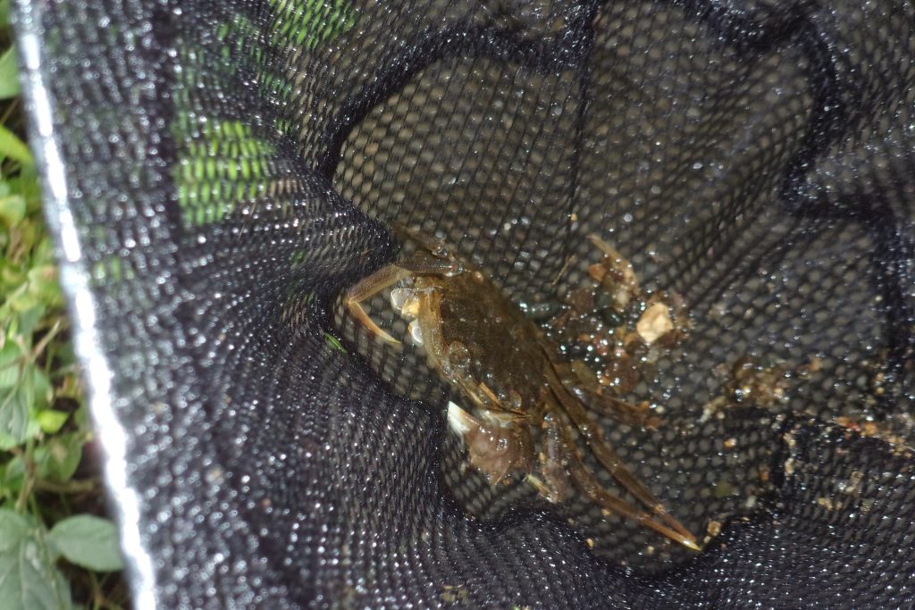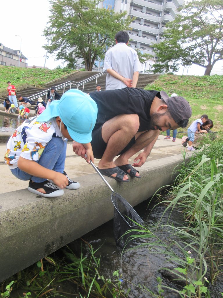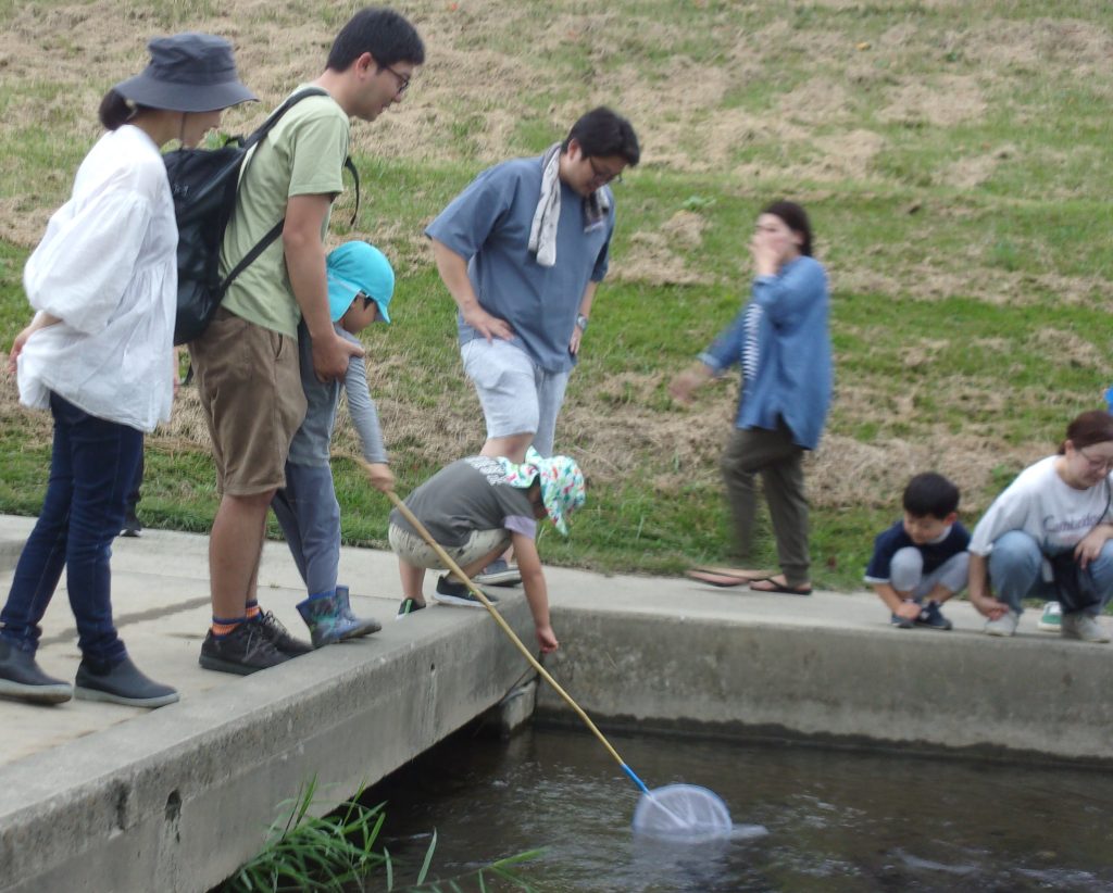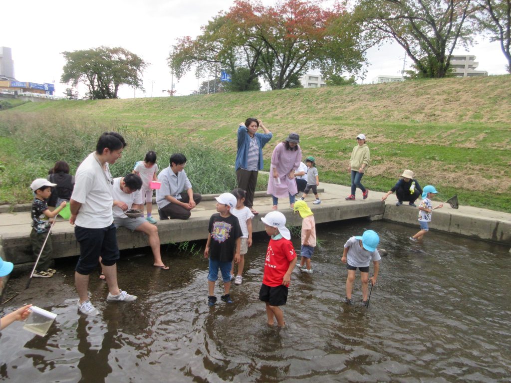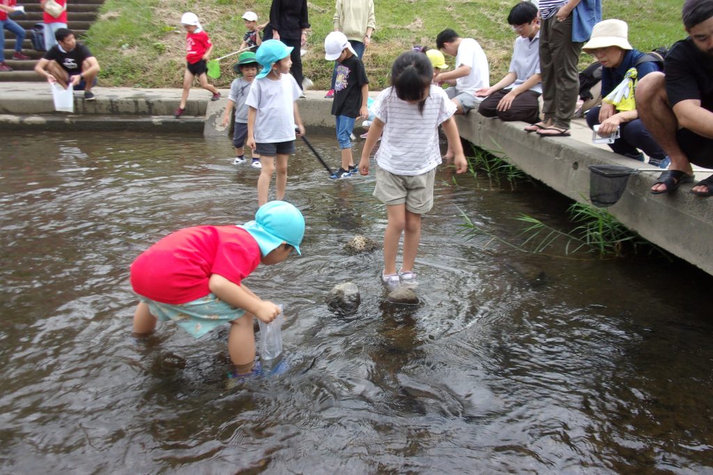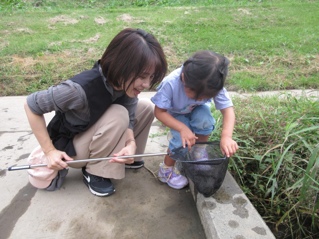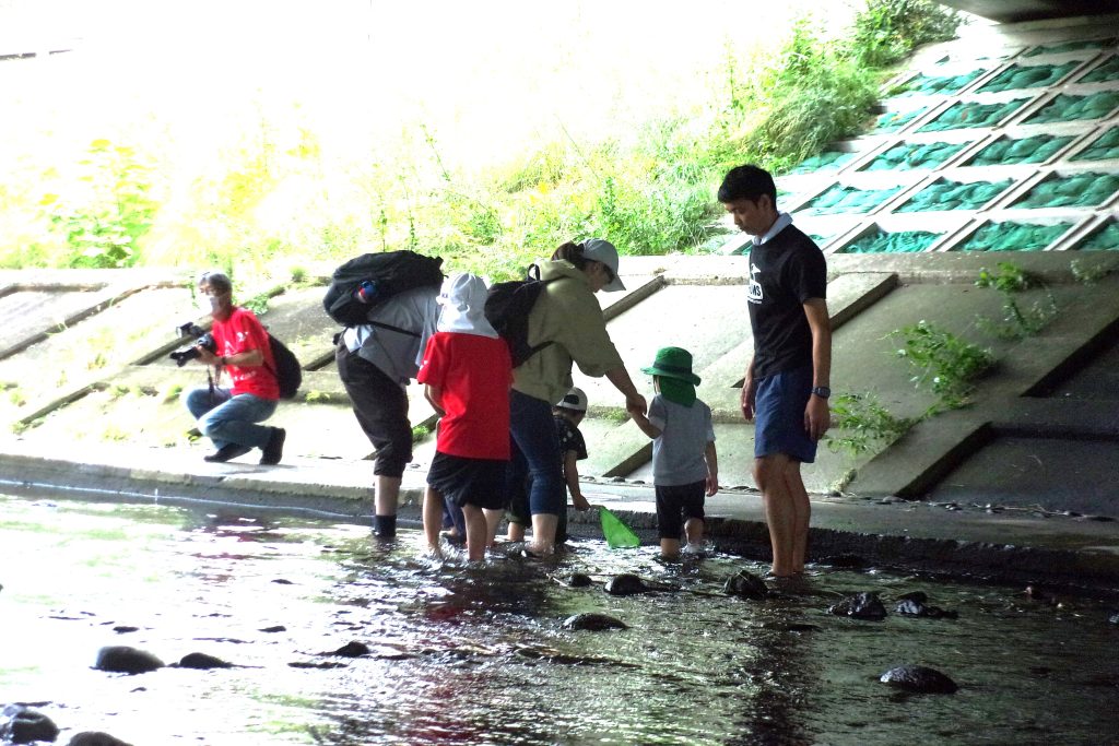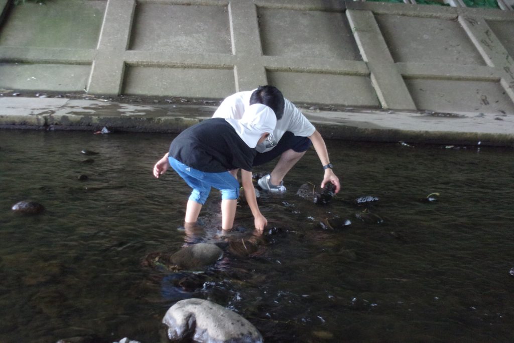 親子で笊川に足を入れ、エビや魚、貝などたくさんの宝物を見つけました✨