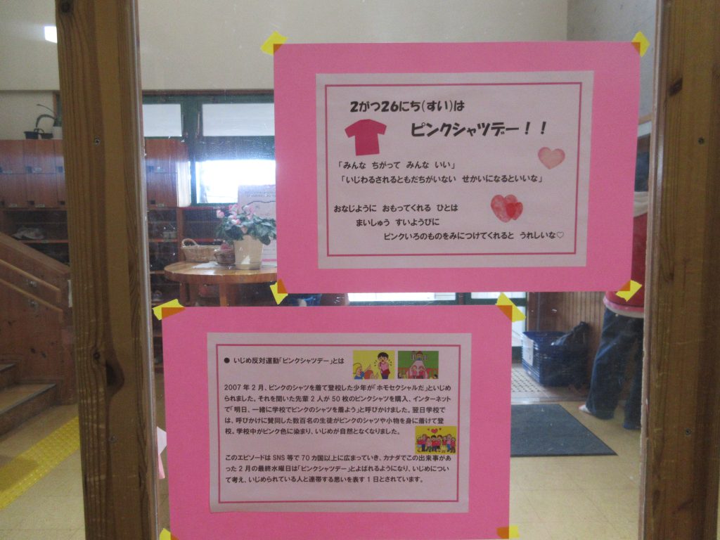 2025年2月26日(水)はピンクシャツデーでした。以前から子どもたちと一緒にこの日のことを絵本やお話を通して考えてきました。