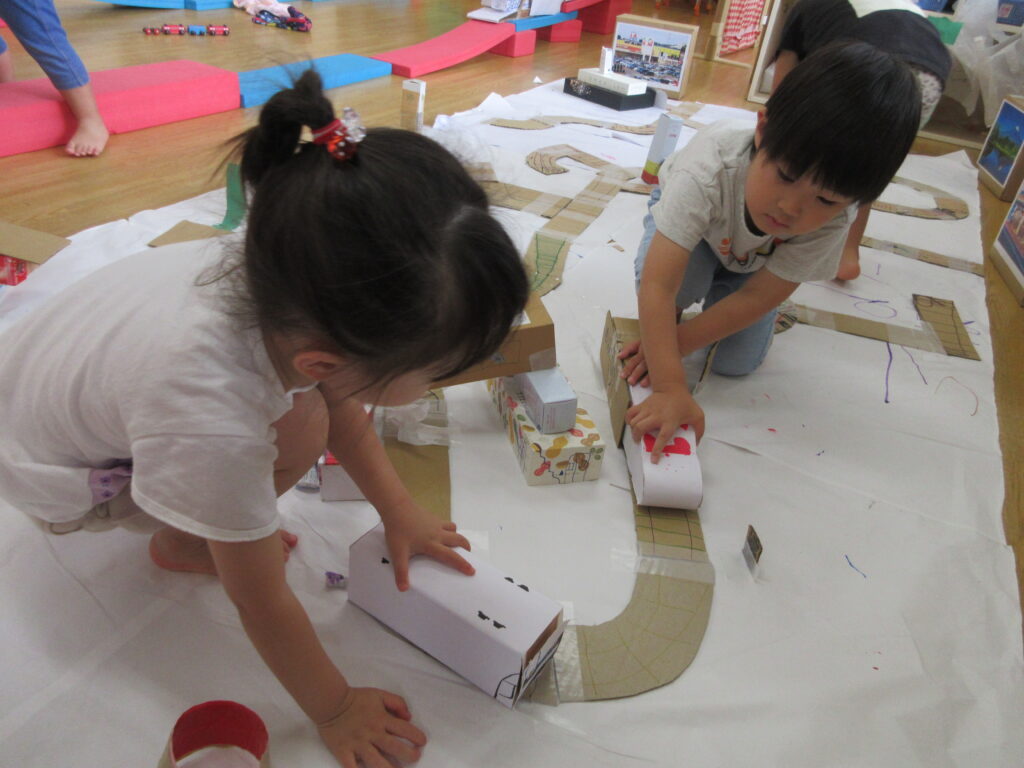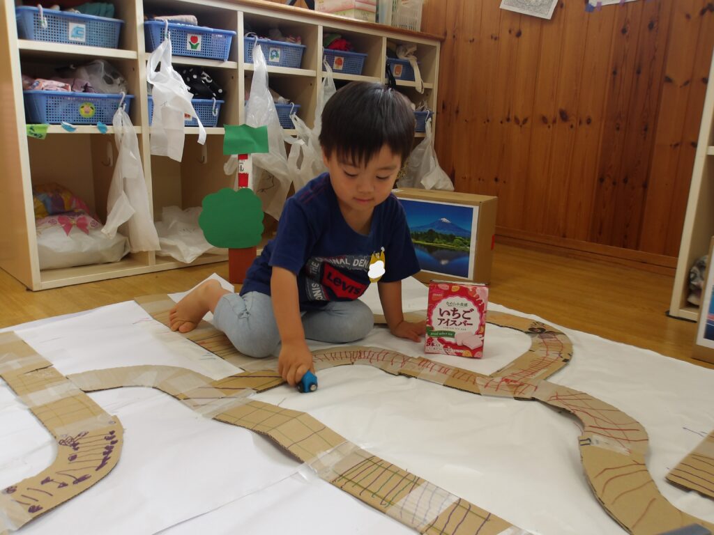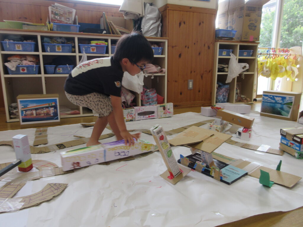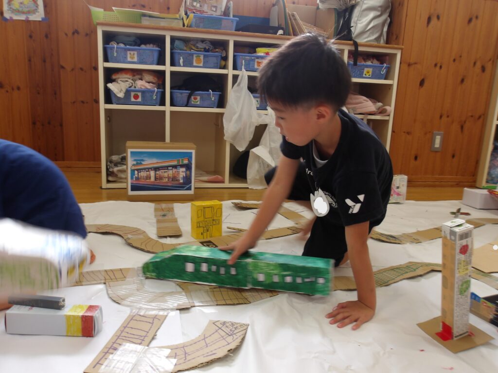 空き箱で作った線路や町や駅を部屋いっぱいに広げて、手作り新幹線を走らせました!