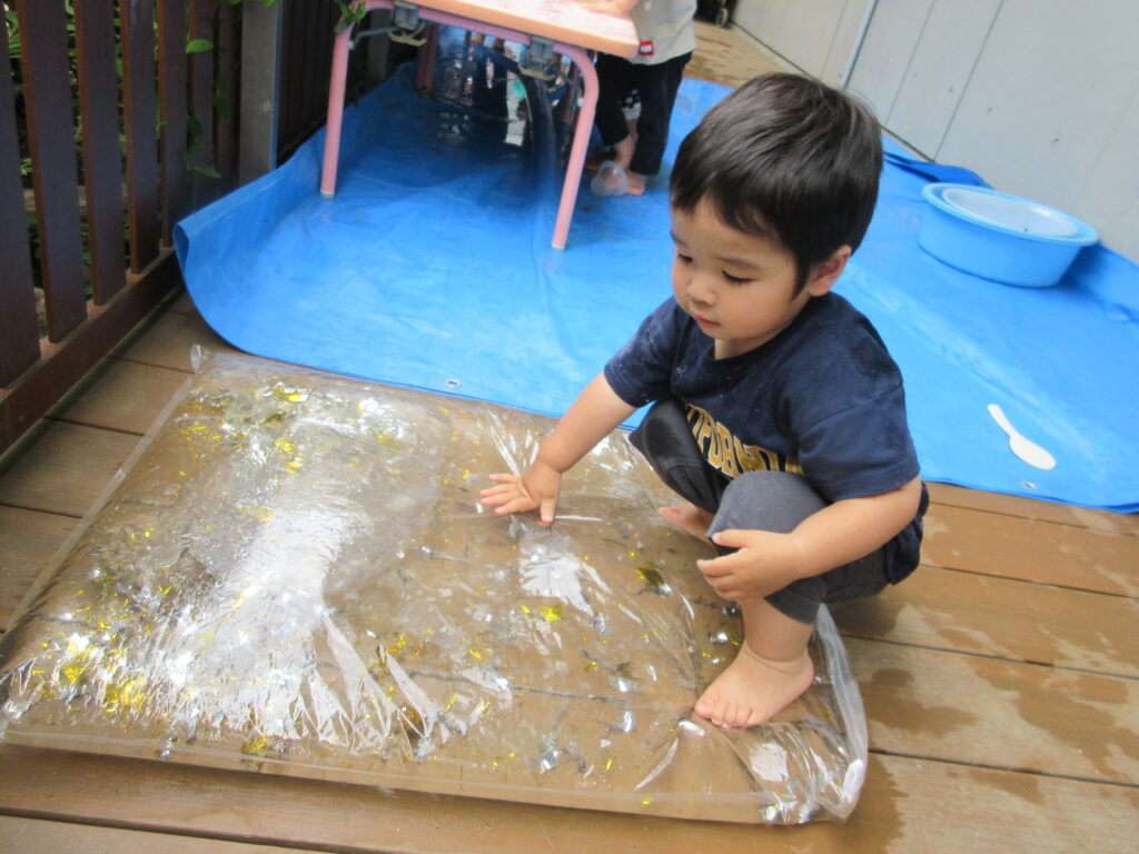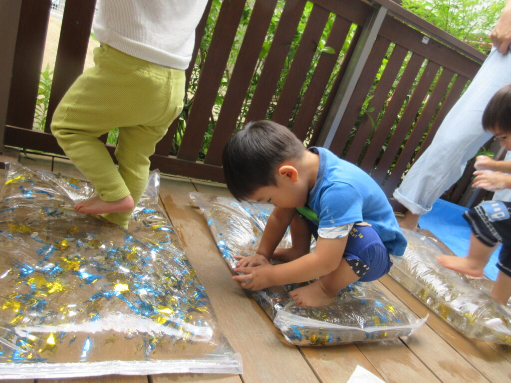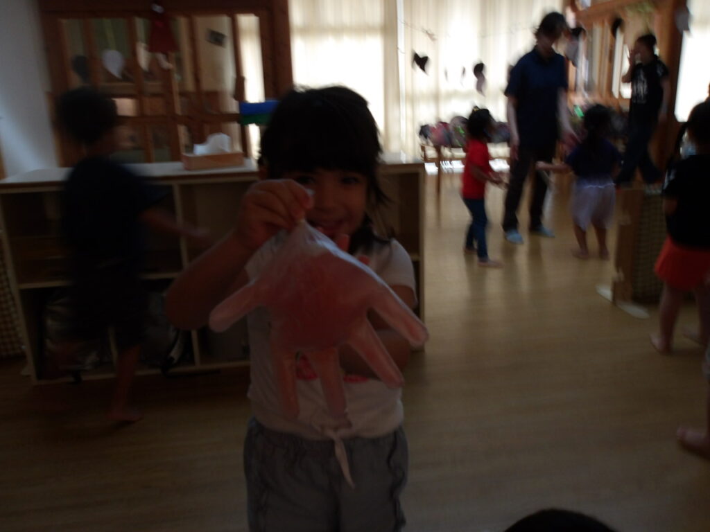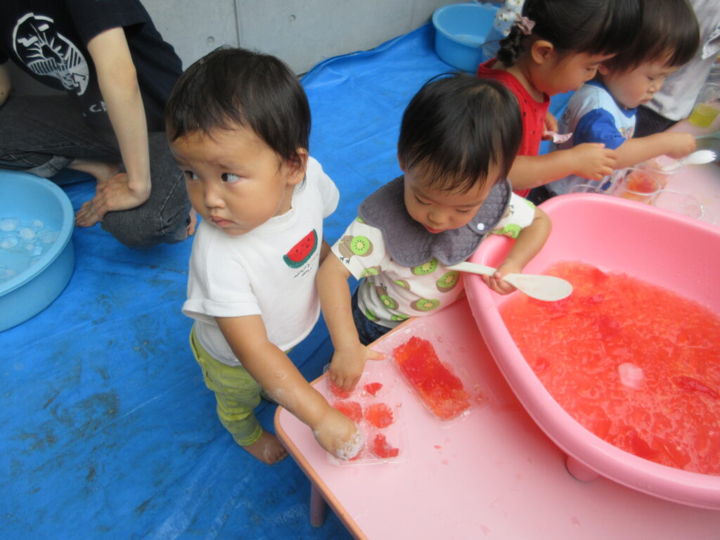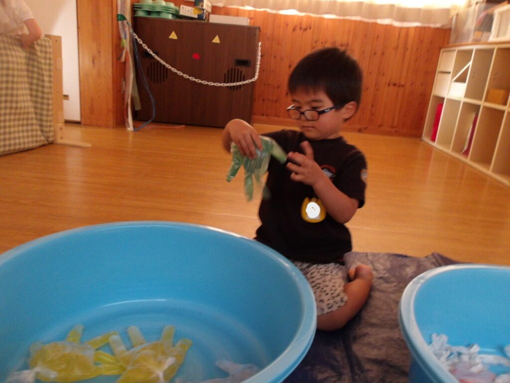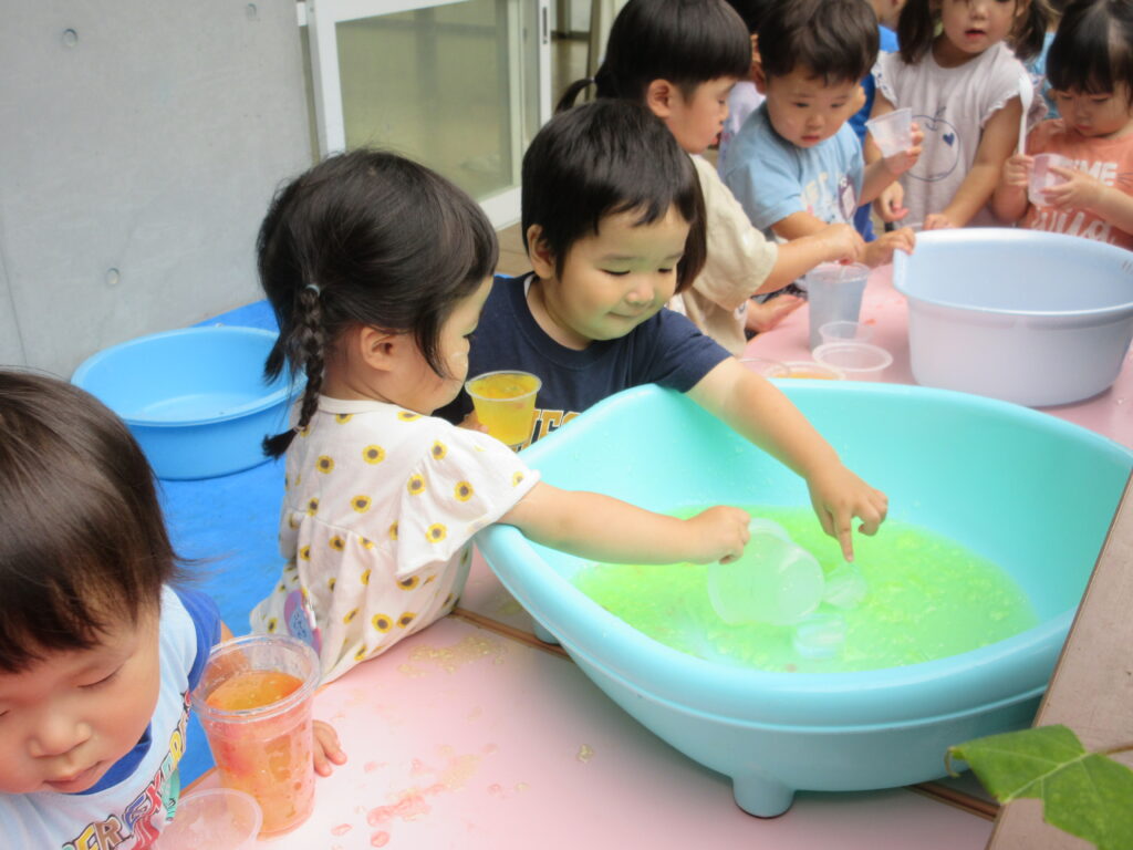 いろんな色の寒天を触ったり、スプーンですくったりして楽しみました!
