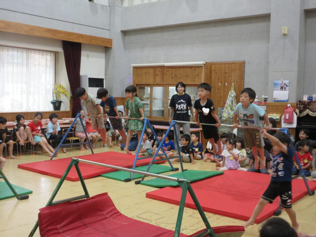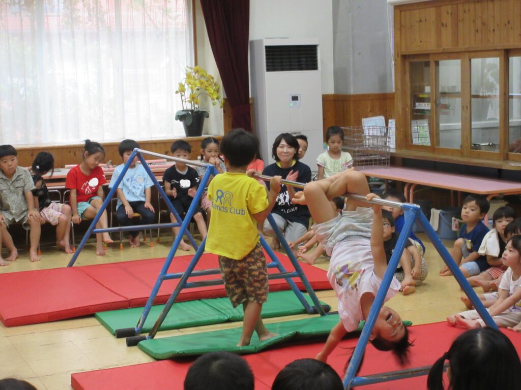 オープニングでみんなの前で披露しようと伝えると、「いいよ!」「やってみたい!」と意欲的でしたが、当日になると緊張する姿も見られました。緊張するのは自分だけではないこと、友だちも一緒にやることで揺れる気持ちを立て直し、選んだ技を堂々と見せてくれました!!