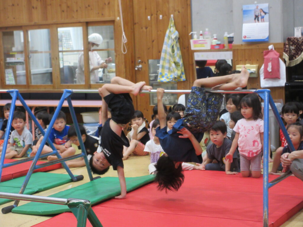 特に5歳児は、「前回り連続5回!」「こうもり10秒キープ!」「逆上がり連続5回!」などの技を見せてくれました。迫力のある技と緊張感を楽しんでいる姿に、観客側の子どもたちも引き込まれ、ホール中に拍手が響き渡りました👏👏