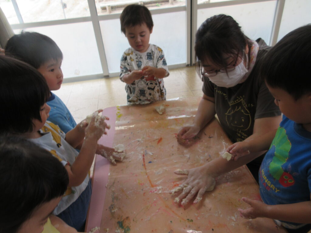 小麦粉に水を入れると徐々にまとまっていき、お皿にのせたり、ピザに見立てて遊びました!